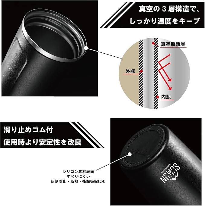 真空断熱構造で、外からの熱を伝えにくく、保温・保冷効果が長続きします。 蓋つきタイプで、カフェタンブラーデザインの飲み口付きで、直飲みもできます。 タンブラー底裏に滑り止め構造で、家・オフィスにも安心して使っていただけます。 さらに密封性があり、持ち運びにも便利で、コンビニ・カフェ・キャンプにもいろなシーンで活躍できます。