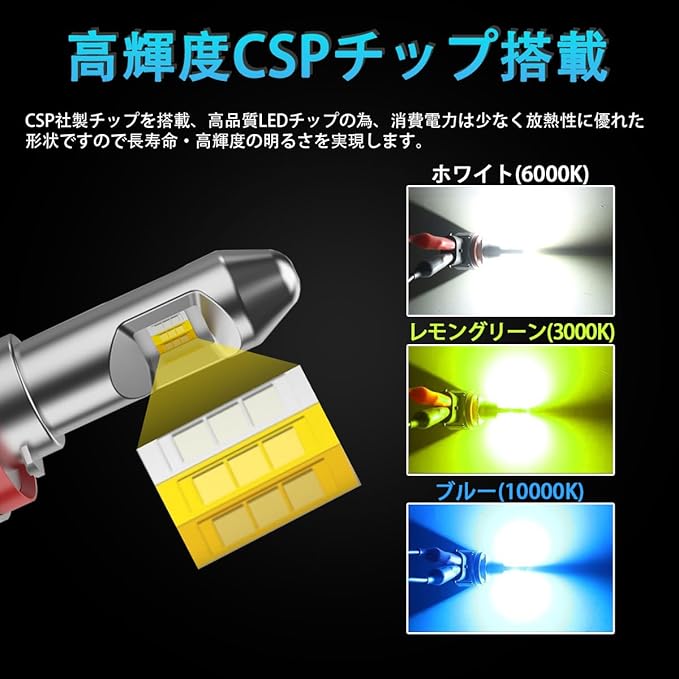 高輝度CSPチップ搭載して、フォグランプとして安定性が強い、環境に優しくて、長寿命・高輝度の明るさを実現。
