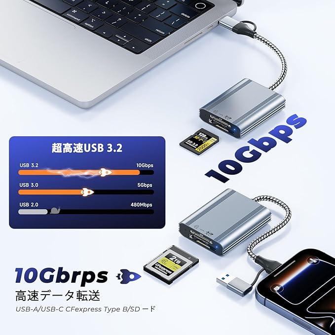 特徴 10Gbpsの超高速データ転送、USB 3.2 Gen 2テクノロジー、CFexpress Type B & SD カード対応