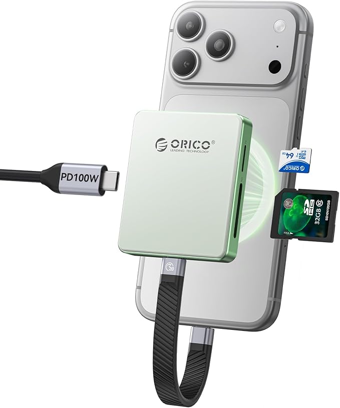 ORICO 5 in 1 磁気吸着式カードリーダー & M.2 ハードディスクケース TF/SD 3.0、M.2 NVMe 2230/2242 SSDインターフェース搭載、USB 3.2 Gen2 10Gbps高速転送、TF-SD 3.0の読み書き速度は最大104MB/s、 PD 100W高出力充電対応マグネット式カードリーダー/M.2 ケース、SSDを含まない -AP42F (グリーン)