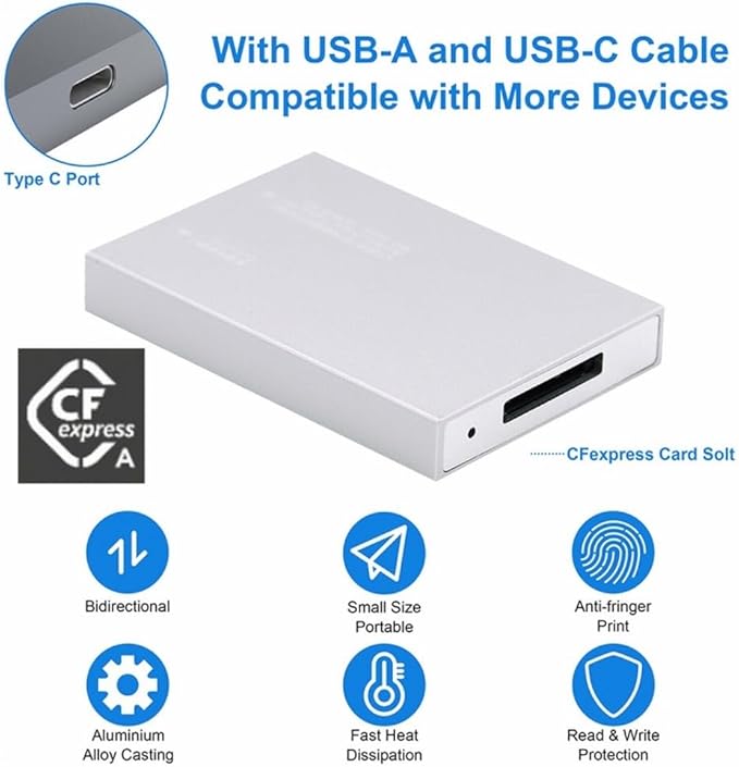 製品の用途: CFexpress カードを USB3.0 または USB3.1 スロットに拡張するのに適しています。(XQD カードには対応していません)。CFexpress メモリ カード USB 3.1 Gen 2 は、Windows、Mac、Linux などのさまざまなプラットフォームと互換性があり、PC、デスクトップ、Mac、iPad で使用してデータ転送を容易にできます。また、タイプ C コネクタをサポートしているため、簡単に差し込んだり取り外したりできます。