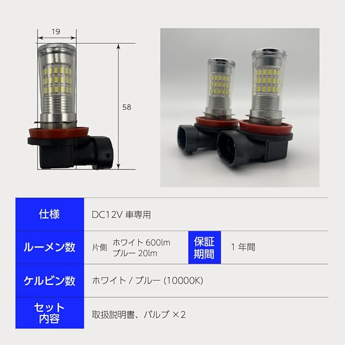 仕様(12V車専用) ・電源:DC12V車専用 ・ホワイト光:600ルーメン(10000K) ・ブルー光:20ルーメン ・カラー:クールホワイト/ブルー ・形状:H8/H11/H16共通(GRX-51)、HB4専用(GRX-52)