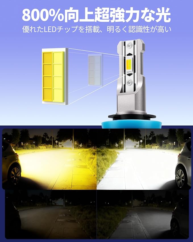 【超強力な光量】このh8 led フォグはなんと驚異的な明るさを持ち、最大12000ルーメンもの光を放ちます!最新技術のチップを採用し、均一で隙間のない光を提供します。h11 led フォグランプ の明るさは800%向上しており、積算球測定の反射光は自動車検査基準に合致します。これらにより、豊かな光量と満足度の高い照明効果を実現し、 前方の道路や障害物をクリアに見え、夜間運転や悪天候下でも安全性を大幅に向上させることができます。