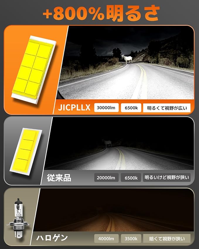 『800%明るさUP』20W*2のハイパワーで、高光効のCSPチップを搭載したのため、30000lmの明るさに出来ます、Y4モデルH11 LEDは8倍以上で、同じファンレス従来品よりも遥かに越えています。