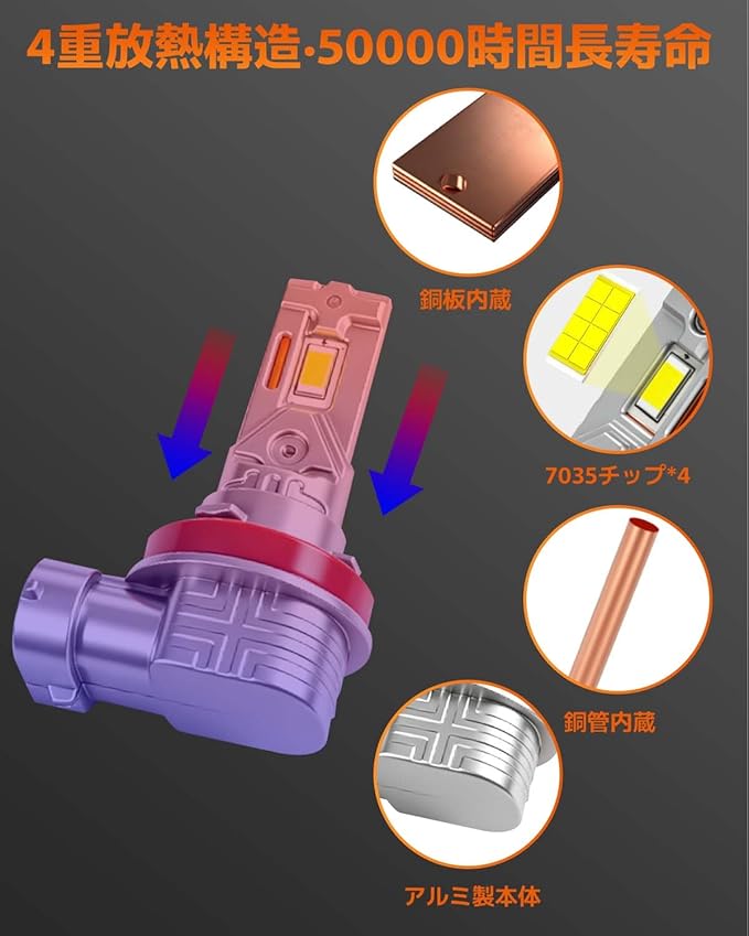 『4重冷却』新しい led ヘッドライト に交換しても明るさに満足できない?期待通りの明るさを持つランプを素早く選ぶコツをお教えします。ランプの放熱効率が高いほど、明るさは増します。当社H11 LEDは高熱伝導性6063航空アルミ合金素材を採用し、1本の放熱銅管、1枚の高効率熱伝導銅板、通気溝設計により4重冷却を実現!放熱効率が大幅向上!過酷な環境下でも、h11 led車検認証モデルは安定した発光を維持し、安全運転を守ります。