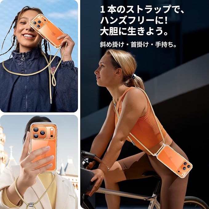 【便利なストラップ付き、両手を解放】 専用ストラップを装備し、【首や手首に掛けて】持ち歩けます。外出時やスポーツ中でもiphone pro max 17 ケースを安全に持てるので、落下や紛失の心配がありません。