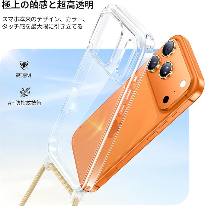 Aunote 対応 いPhone17promax ケース 薄型 軽量 耐衝撃 携帯 紐付き 斜めがけ 織りストラップ付き ネックストラップ ショルダー長さ調整可能 落下防止 紛失防止 対応 iPhone 17 Pro Maxケース クリア+デザートゴールド ショルダース