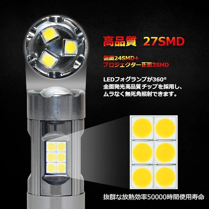 【製品情報】:H8/H9/H16 兼用、LED フォグランプ、ホワイト 純白色 6000K、高品質 LG 27SMD(側面24SMD+プロジェクター正面3SMD)を搭載、悪天気(雨、霧、雪など)の視認性を大幅に向上させます、事故を削減し、安全運転を確保します。【ご注意】本商品は日本車専用で、欧州車に使うと、取付車両によってチラつきや不点灯などの場合もあり、メーターに球切れや警告灯などエラー表示が出る場合もあります。