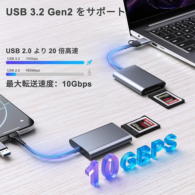 CFexpressカードアダプタのための10Gbpsの最高速度: CFepxpress Type BカードリーダーはあなたのCFexpressカードのためのUSB3.2 Gen2 (10Gbps)の最高速度のデータ転送を支える。注:最終的なデータ転送速度は、カードとUSBスロットのタイプによって決まります。