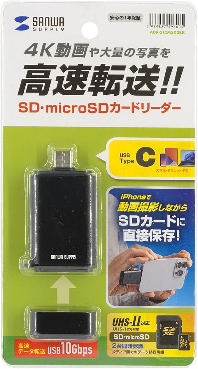 サンワサプライ UHS-II対応 USB Type-C カードリーダー ADR-5TCMSD2BK