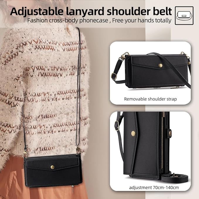 for iPhone 17 Pro Max ケース 財布型 for iPhone 17プロ マックス 手帳型 ショルダー ストラップ長+短2本 5枚カード収納 1枚の写真収納スタンド機能 1枚の現金収納 1つのジッパーポケット 防落・防コケ・防ひび PUレザー プレゼント COCOCLOUD ブラック01