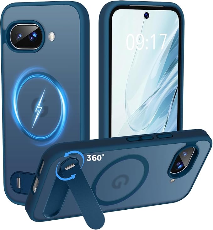 Google Pixel 9A 用 ケース 360 回転スタンド 付き MagSafe 対応【横縦両立・角度自由調整】内蔵インビジブルスタンド 指紋防止 半透明マット TPU+PC 黄変防止 ワイヤレス充電対応 耐衝撃 マグネット搭載 車載ホルダー Pixel 9A カバー 6.3 インチ (ブルー)