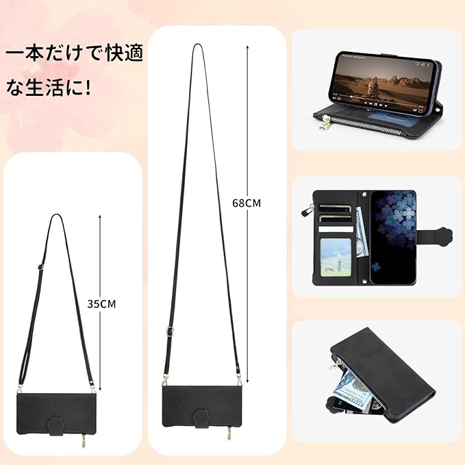 CASAFUNY 適用【Google Pixel 9a ケース 手帳型 ショルダー】スマホケース 肩掛け 斜めがけ 手首かけ、掛けストラップ付き 長さ調整可能 適用 グーグルピクセル9a ケース 手帳型 ファスナー型 小銭入れ 大容量 カード収納 財布型 耐衝撃 本革レザー 用の Pixel9aカバー かわいい 美しい桜の柄 携帯カバー マグネット式 スタンド機能(6.83インチ)くろい