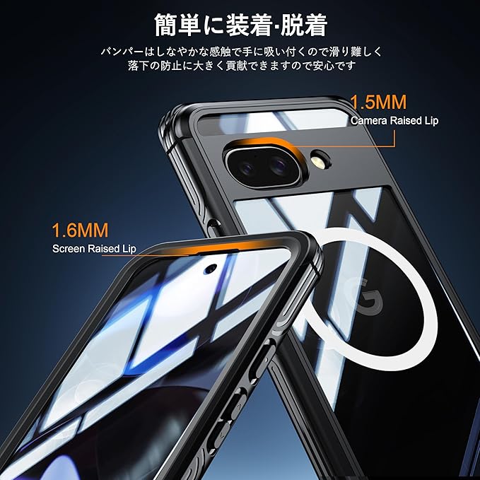 このピクセル 9a ケースは耐震性の高いTPUバンパー、前面強化ガラスと頑丈な複合材料背面と組み合わせた両面構造で、非常に高い耐衝撃性を誇り。全方位からPixel 9A をしっかりと守って、安心感を与えると同時に、スクリーンフィルム単体で購入するコストを節約することができます。Pixel 9a ケースは四隅で衝撃を吸収する「クッションコーナー」を採用、盛り上がったエッジは、落下やその他の衝撃から画面とカメラを保護します。