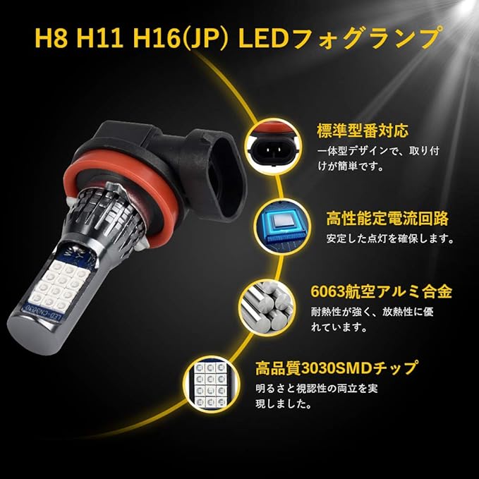 【商品仕様】バルブ規格:H8 / H11 / H16(国産車)、用途:フォグランプ、カラー:ブルー、LEDチップ採用:3030SMDチップ、LEDチップ数:24連(片方)、対応電圧:DC 9-24V、消費電力:7.6W(片方)、ルーメン:2400LM(片方)、保証期間:お買い上げ日より6ヶ月保証付き、商品を受け取り次第何か不良や故障等ございましたら、メールでご連絡を下さいませ。弊社は迅速にご返金、もしくは新品を再発送させて頂きます。。