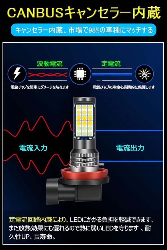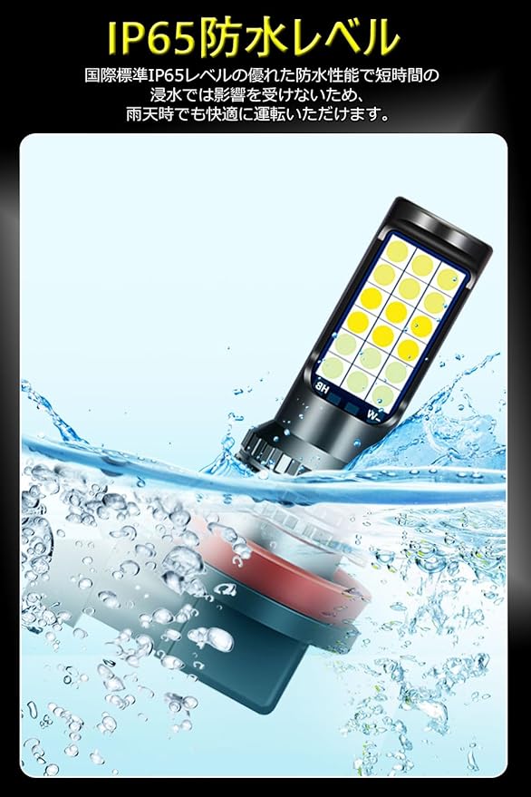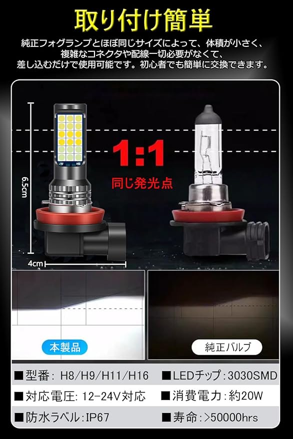 超高発光効率チップ:この H8/H9/H11/H16 led フォグランプは高品質 3030 LEDチップ採用、発光効率が大部アップ!両面チップ、均一で、高効率の発光を持って、明るさと安定性を大幅に向上させることで、視認性の高い、通常のハロゲンバルブより大きな贯通力を持つ、雨や霧、雪などの悪天候にしても良い視野を提供します。