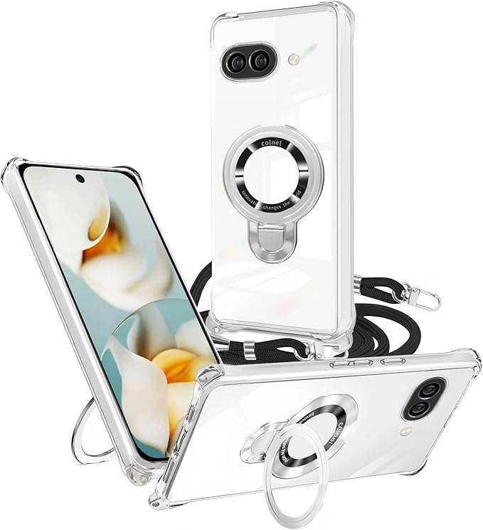 Google Pixel 9A ケース クリア リング付き MagSafe対応 ショルダー pixel 9a ケース 耐衝撃 ピクセル9a 対応 スマホケース ワイヤレス充電 マグネット搭載 調節可能 保護ソフト 取り外し 薄型 TPU 肩がけ 首掛け 紐付きバンパー ストラップ付き ホール付き 透明 着脱可 Qi充電 すり傷防止カメラ保護(縄掛け-ブラック)