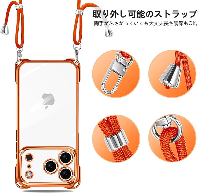 iPhone 17 Pro Max 用 ケース クリア ショルダー iphone17pro max スマホケース アイフォン17ProMax カバー 肩掛け 斜めかけ 縄掛けケース 透明 TPU 薄型 軽量 耐衝撃 紐付き 斜めがけ 織りストラップ付き ネックストラップ ショルダー 縦/横 2WAY 長さ調整可能 取り外し可能 落下防止 紛失防止 (オレンジ)
