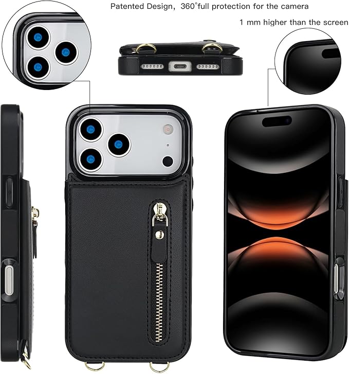 BonwFzin 適用 IPhone 17 Pro MAX ケース ショルダー ストラップ 背面 フリップ 紐付き アイホン 17プロマックス スマホケース 手帳 アイフォン 17プロマックスケース RFID防止 肩がけ 首掛け 斜め掛け 小銭入れ ファスナー型 ストラップ付き スタンド カード入れ ブラック