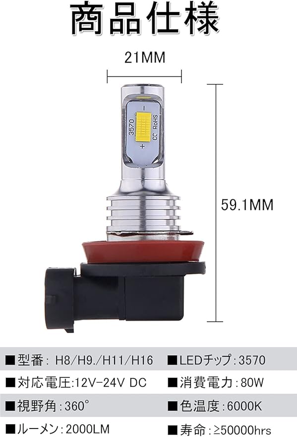 ➊高輝度:このh8/h11 ledフォグランプは両面抜群の視認性高品質3570 CSPチップ搭載採用して、ハロゲンより50%省エネなのに300%明るさUP!超輝度で、ハロゲンより大幅に視認性を高めています。大雨の中屋道の悪い路面を走行しても高い耐久性を発揮し永くご愛用していただきます。特に夜間の雨 雪 霧などの悪天候で威力を発揮する光色。