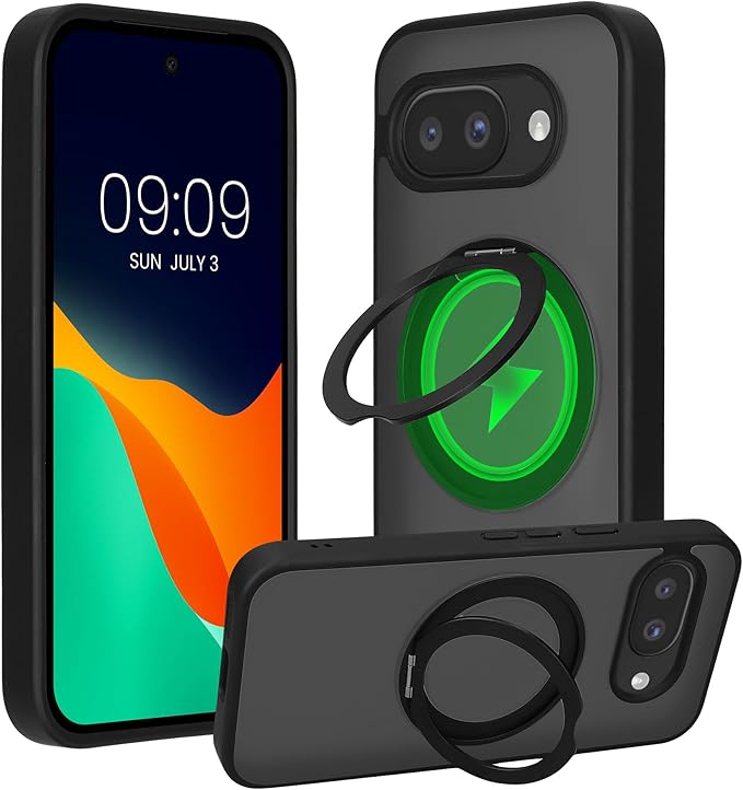 商品タイトル(最適化済み)kalibri スタンドリング付きスマホケース - Google Pixel 9a 対応 360 回転式キックスタンド ハードケース MagSafe対応 - 黒色/半透明