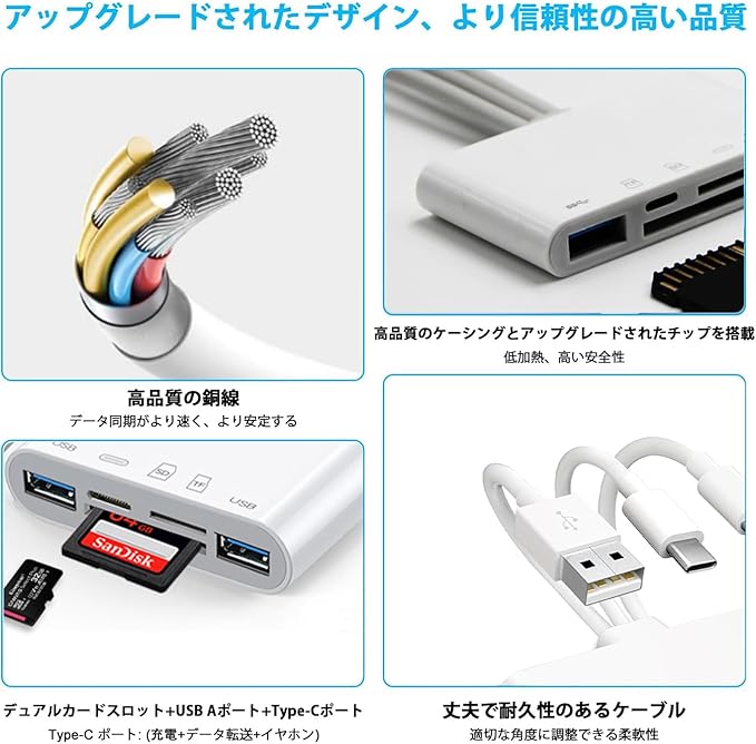 【6-in-1カードリーダー】USB/SD Card/TF Card スロットが一つずつ搭載されているタイプC OTGカメラアダプタです。1つのカードリーダーに複数の機能が備えているので、幅広い機種と互換性があり、いつでもどこでも写真や動画やファイルなどを共有することができます。それだけではなく、端末の容量不足も解消できます。