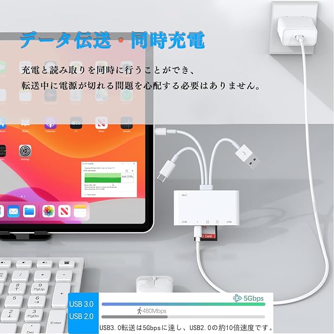 【高速・双方向データ転送】最大5Gbpsの高速データ転送に対応しているので、カメラの写真やビデオをあっという間に移行可能です。デジカメからAndroidスマホにデータ転送はもちろん、容量不足を解消するため逆にスマホからUSBメモリへデータを移動することもサポートしており、双方向でデータを取り込めます。(注:一回一枚メモリカードしか読み書きません。)