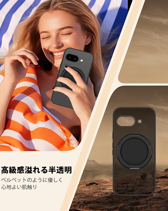 Google Pixel 9a ケース 半クリア リング付き 360 回転スタンド MagSafe対応 ワイアレス充電対応 耐衝撃 グーグル ピクセル 9A カバー 軽量 薄型 人気 pixel9a スマホケース 半透明 PC + TPU 車載ホルダー対応 (ブラック)
