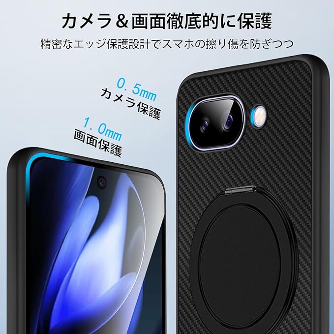 Google Pixel 9a 用 ケース リング 360 回転スタンド 縦横両対応 pixel 9a ケース 耐衝撃 アラミド繊維製 黄ばみ防止 車載ホルダー 指紋防止 薄型 おしゃれ ピクセル9A スマホケース (ブラック)
