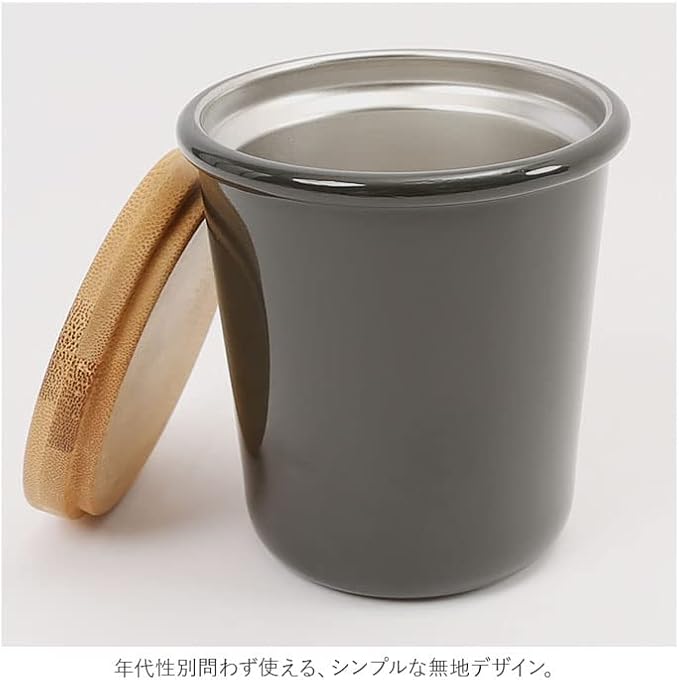 光沢塗装をかけてホーロー感を演出。飲み口は口当たりの良い丸みのあるデザイン。付属の竹蓋を被せることでほこりの侵入を防ぐことができます。
