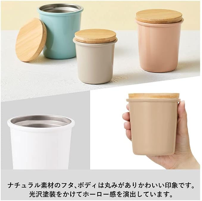 丸みのあるかわいらしいフォルムのステンレスタンブラーです。ナチュラル素材のフタ、ボディは丸みがあり、可愛い印象です。