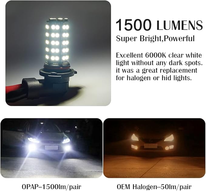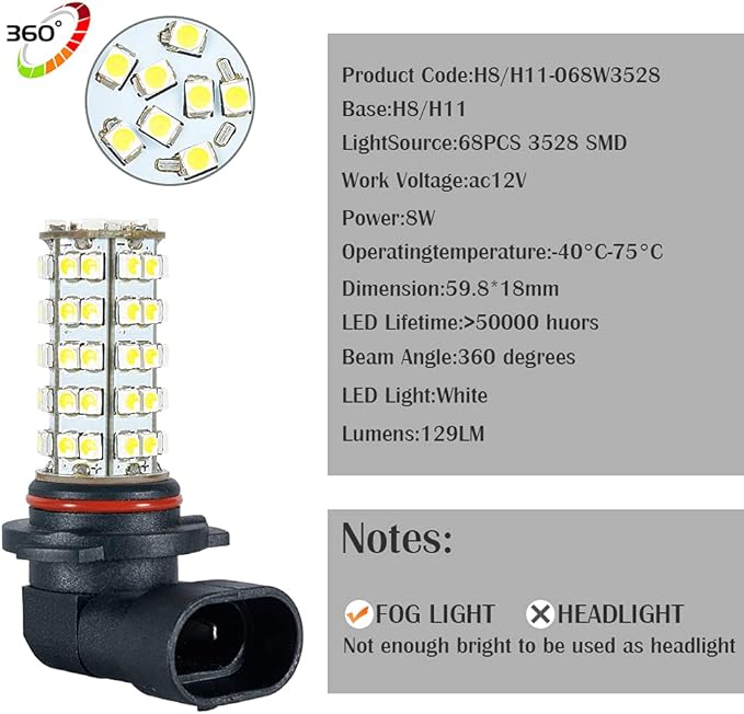 1.【製品情報】:【型番】H11 / H8 。【明るさ】1500Lm/個。【チップ】1つのLEDランプには、68つの3528のSMD-LEDチップがあります。【照射角度】360 。【光色】ホワイト(6000K-6500K)。【パワー】16W 。【対応電圧】DC12V.