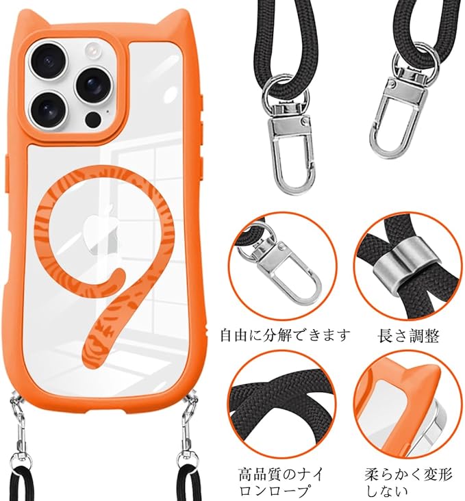 【多目的キャリー & ファッションデザイン】iPhone 17 Pro Max ケースにはネックバンドが付属しています、可首掛け 、可肩掛け、斜め掛けストラップなど様々な用途に活用できる携帯ストラップ。ショルダーストラップの長さは個別に調整できます、手を離しても、携帯電話を携帯できます、携帯を無くす心配もいらないです、作業、旅行、出張、ショピング、散歩、コンサート、パーティーに最適です。柔らかいナイロンストラップで首を快適に保ち、ストレッチの長さを調整でき、取り外しやすいのも特徴です、ストラップを取り外して、電話ケースを単独で使用できます。