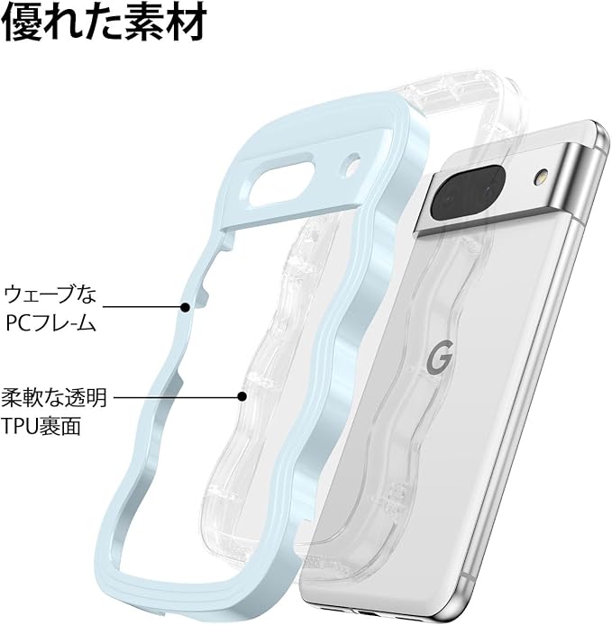 【透明感 ▪ フィット感】背面は透明度ポリカーボネートの素材で、Pixel 9A本来の美しさと高級感をそのままに映り出し、いつものスマホに上品さをプラス。サイド周りのウェーブ部分はプラスチック素材で取り外し可能です。後ろはクリアなので、推しメンやお好きな装飾を挟んで、オリジナリティを楽しむことができる!