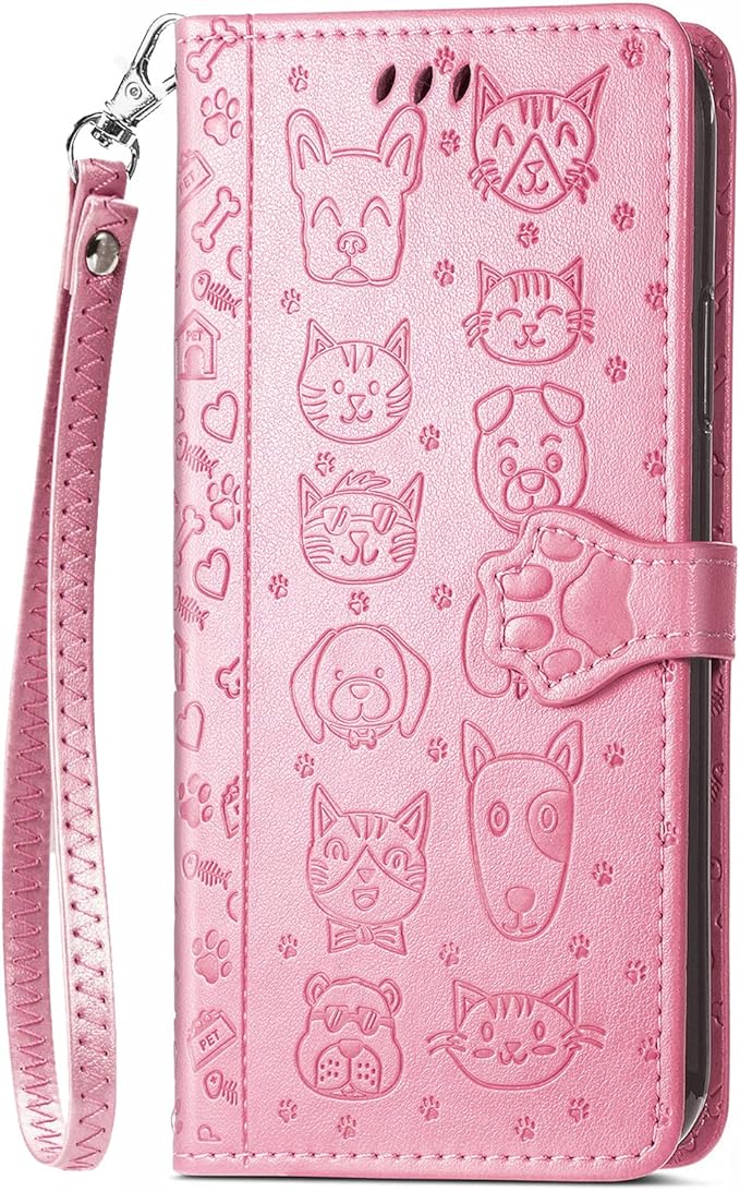 かわいいデザイン:犬と猫の可愛らしい動物柄がエンボス加工されたピンク色のPUレザー素材で、肉球や魚の骨などの愛らしいモチーフ付き