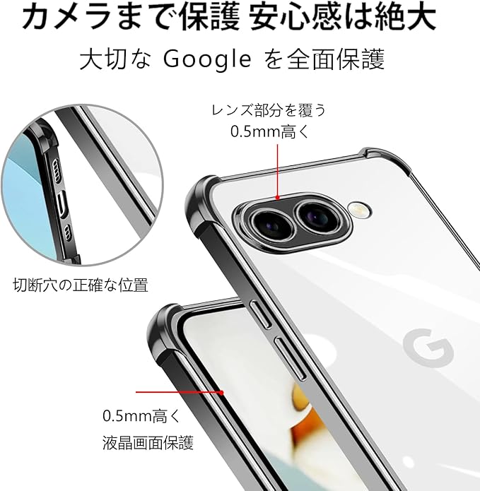 【 高い透明度 】 ケースは特別に開発されたハイテクTPU素材で作られています。 透明度が高く、本体の鮮やかな色をそのまま映し出すことができ、Google 9a/ピクセル9A 対応 のオリジナルのカラーを損ねません。ケースの端はダイヤモンドカットプロセスを施すことでより洗練された美しい外観となっています。ケースは、型どりを緻密に実施しており、Google 9a/ピクセル9A 対応 を保護しているのです。これは Google 9a/ピクセル9A 対応 の Qiワイヤレス充電 と 指紋認証 を完全にサポートします。