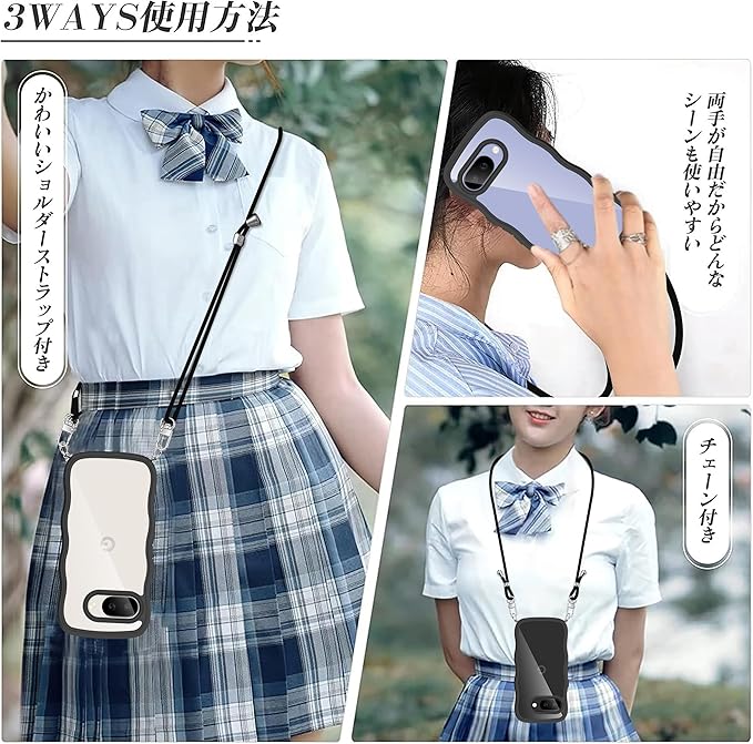 Google Pixel 9A ケース クリア ショルダー グーグル ピクセル9a カバー うねうね 透明 人気 かわいい 耐衝撃 スマホケース ストラップ付き 取り外し可能 長さ調整可能 首かけ 肩掛け 薄型 軽量 TPU ワイヤレス充電対応(ブラック)