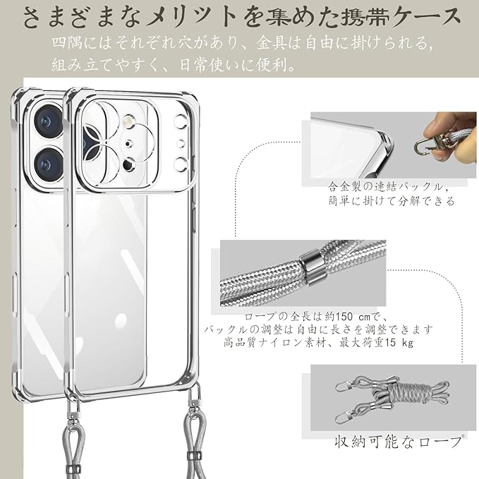 iPhone 17 Pro Max 用の ケース クリア ショルダー 耐衝撃 アイフォン17 Pro Max カバー ストラップ 透明 スマホケース 電気メッキ加工 肩がけ 首掛け 紐付き 縄掛け 斜めがけ 調節可能なショルダー TPUスマホ (シルバー)