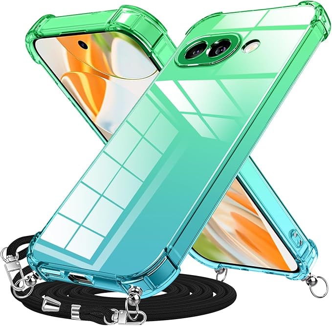 Google Pixel 9a 用 ケース クリア ショルダー ストラップ グラデーションカバー 紐付き 肩掛け 斜めかけ 縄掛けケース 耐衝撃 TPU エアクッション 調節可能な 透明 薄型 軽量 ネックストラップ 落下/紛失防止 ワイヤレス充電対応 可愛い ピクセル9a 用 ケース グリーン AYS-8-101