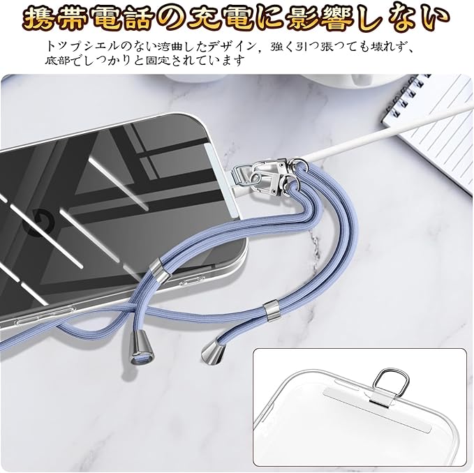 【装着簡単・充電に干渉しない】タグパッチをケースとスマホの間に挟んで、ストラップホールが外付けなので、自分好みに合わせて、ネックストラップやハンドストラップに装着できます。装着しても何もつけないような薄型がデザインされます。わずか0.4mmの薄さで、ケーブル/ワイヤレス充電に邪魔しません。【浮きにくい折り曲がれ設計・ステンレス製】金属製 1、TPU 1