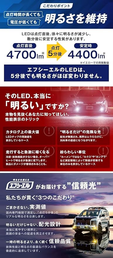 【圧倒的な光量と対向車に配慮した配光設計】純正比約7倍の明るさを誇るL1B LEDバルブです。暗い純正(約600lm)に対し、実測値最大4400~5000lmを実現。夜間や悪天候時の視認性を劇的に向上させます。単に明るいだけでなく「どこを照らすか」も追求し、対向車への眩しさを抑える明確なカットラインを実現しました。純正では暗かった左右や手前側までムラなく照射し、安全運転を強力にサポート。放熱性に優れたボディと静音ファンにより、安定した明るさと耐久性も確保しています。
