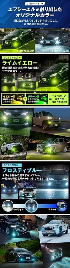 【本製品に関する注意事項】・ 取り付けに20トルクス等の工具が必要な場合があります。・高温時は保護機能により自動で減光します。■車検について:フロスティブルー・アンバーは非対応です。ライムイエローも検査官の判断によるため、車検時は必ずホワイトまたはイエローに切り替えてください(メモリー機能にご注意ください)。■取付不可車両:24V車/輸入車/純正フォグランプユニット未装着車/純正バイカラーLEDフォグランプ装着車 ※車種・グレードによっては取付できません。必ず適合表をご確認ください。特に次の車種は購入間違いが増えているためご注意ください。【ノア 90系】S-Z/S-Gグレード:フォグユニット タイプB / Zグレード、Xグレード(後期のみ):L1Bバルブ【RAV4 50系】アドベンチャーグレード:フォグユニット タイプB / それ以外:L1Bバルブ ■稀に車両制御により「ちらつき」や「エラー」等の症状が出る場合があります。その際は別売の電圧安定用リレーをご使用ください。リレーが必要な特定車種は適合表に記載しておりますが、全車両での改善を保証するものではありません。