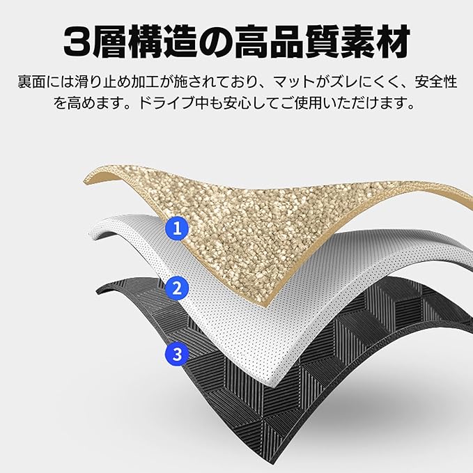 【汚れ防止&清掃簡単】防汚加工が施されており、飲み物や泥汚れも簡単に拭き取ることができます。日常のお手入れが楽になります。裏面には滑り止め加工が施されており、マットがズレにくく、安全性を高めます。ドライブ中も安心してご使用いただけます。
