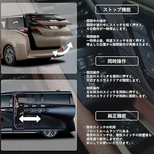 <ストップ機能> 開閉中にスイッチを短く押すと、その動作が一時停止します。 お好きな位置で停止させることができます。 <同時操作も可能> スライドドアは左右のスイッチを個別に押せば対応するドアが開閉します。さらに、左右両方のスイッチを同時に押せば、両方のスライドドアが同時に開閉します。 <純正機能> フロントルームランプにある既存のスイッチは、増設スイッチ設置後も通常通り動作いたしますので安心してお使いいただけます。 <LEDライト搭載> 夜間でもLEDライトが点灯するのでスムーズに操作することができます。