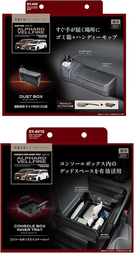 SY-AV8 40系 アルヴェル専用 サイドBOXゴミ箱プラス 運転席用 商品説明 40系アルファード・ヴェルファイア(AAHH4#/AGH4#/TAHA4#)右ハンドル車の運転席側フロントドアポケット専用のゴミ箱&折りたたみ式ハンディーモップ(専用ケース付き)です 専用設計で、運転席側フロントドアポケットにピッタリフィットします 運転席側フロントドアポケットに入れるだけの簡単取り付けです フタを押すと開き、フタを閉じて押すとロックする構造で、簡単に開閉することができます フタにはダンパーを採用し、スムーズな動きで開きます たまったゴミは本製品のゴミ箱を上下分割して捨てることができます ホコリをしっかりキャッチする極細繊維のハンディーモップを付属しています 内装に合わせた革シボ調です ゴミ箱の容量は約1.3Lです 調査日(2023年5月現在)以降のマイナーチェンジ車には適合しない場合があります 運転席側フロントドアポケットに追加オプションが装着されている車両へは取り付けできません SY-AV10 40系 アルヴェル専用 コンソールボックスインナートレイ 商品説明 40系アルファード・ヴェルファイア(AAHH4#/AGH4#/TAHA4#)右ハンドル車のコンソールボックス専用のトレイです 専用設計で、コンソールボックスにピッタリフィットします 両面テープで貼り付けてセットするだけの簡単装着です スマートフォンや財布等の小物を手軽に置けます 収納物が傷付かないクッション付きです センタートレイ裏側にボックスティッシュをベルトでセットできますボックスティッシュの取り替えはベルトを調節するだけで簡単に行なえます 内装に合わせたシボ調です 調査日(2023年5月現在)以降のマイナーチェンジ車には適合しない場合があります コンソールボックスに追加オプションが装着されている車両へは取り付けできません 収納物によっては、コンソールボックス内の電源等が使用できなくなる場合があります 本製品は下記の条件を満たすボックスティッシュに対応します 袋入りタイプのティッシュには対応しません