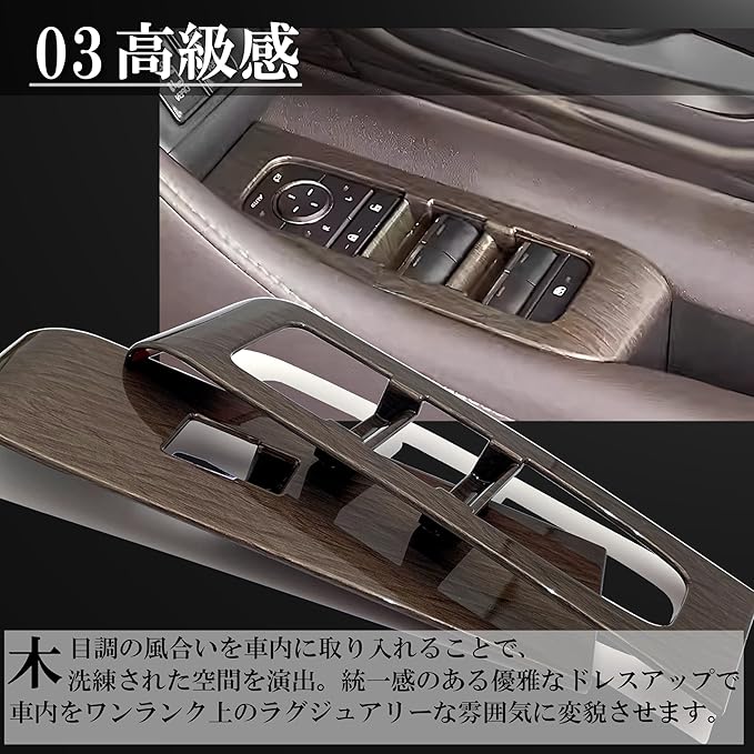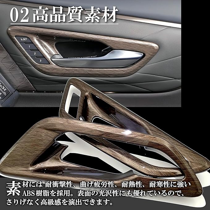 【木目調の美しさで、自然の温かみと上質さをプラス】 自然を感じさせる木目調デザインで、車内に温もりと高級感を融合。美しい仕上がりは、ドア周りの雰囲気をワンランク上の空間へ引き上げ、乗るたびに特別な満足感を提供します。