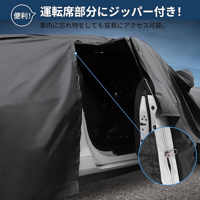 【運転席側に便利なファスナー付き】運転席側にはファスナーが設けられているため、車カバーをかけたままでも、車内に忘れた物を思い出した際には、ジッパーを開けるだけで瞬時に取り出せます。ジッパーがない場合、カバーを何度も脱着する手間がかかりますが、 X AUTOHAUX車カバーは実用性と利便性を兼ね備えており、日常の中で愛車を手軽に保護できます。