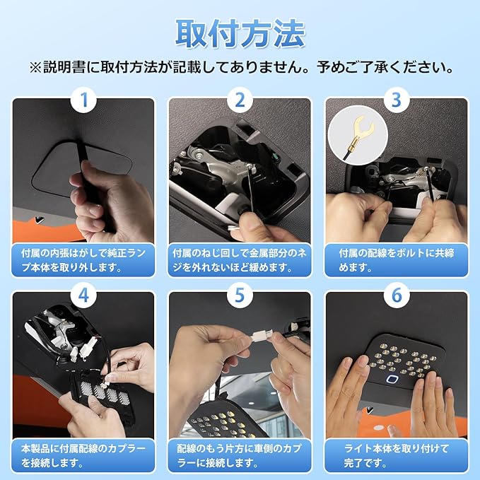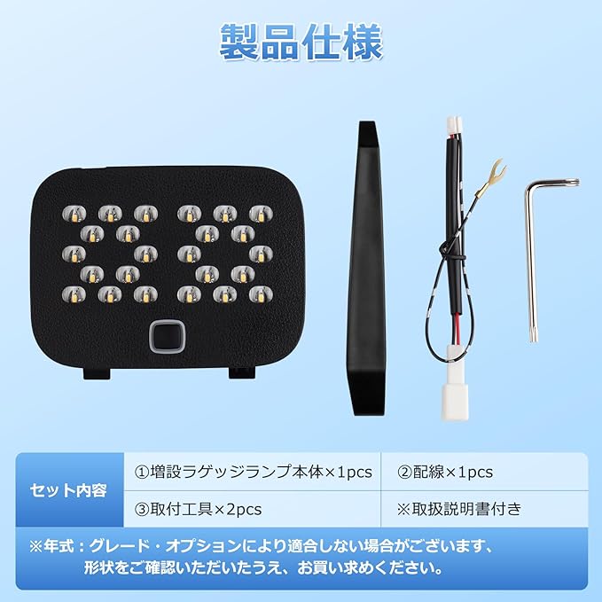 1.【適合車種】①トヨタ アルファード ALPHARD 40系;型式:AGH4#W/AAHH4#W;年式:2023年6月~現行;②トヨタ ヴェルファイア VELLFIRE 40系;型式:TAHA4#W/AAHH4#W;年式:2023年6月~現行;セット内容:増設ラゲッジランプ本体 1pcs、配線 1pcs、説明書 1pcs、取付工具 2pcs。※グレード・オプション等により形状が異なる場合もございます。画像にて形状やサイズをご確認いただいたうえ、お買い求めください。