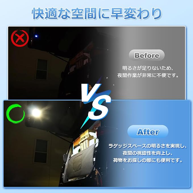 2.【省エネ・高輝度・長寿命】純正のラゲッジスランプは明るくなく、夜間でラゲッジスペースを利用する時、とても不便だと思うことがありませんか?本ラゲッジランプは高輝度24連LEDチップを採用し、省エネ・高輝度・長寿命の特性があり、電気消費を抑えつつ、ラゲッジスペースの明るさを実現し、夜間の視認性を向上し、荷物をお探しの際にも便利です。
