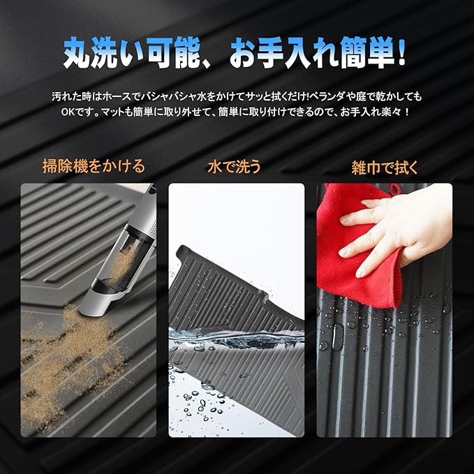 【環境にやさしい新素材を使用】TPEという新しい素材を使用しています。耐老化性、防水性、耐薬品性、耐溶剤性、非毒性、安全性などの特性を持ち、手触りが良く、高い反発力弾性持ち、長年使用しても、何度も折り曲げでも割れ、変形、変色を起こさない。ゴムのようにしなやかで摩擦に強く耐久性があり、プラスチックのように形が崩れず、車内に設置するマットに最も適す素材です。